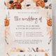 Ces invitations de mariage tout-en-un, magnifiques et romantiques, présentent un style boho branché et une élégante calligraphie bordeaux. Des bouquets bohèmes rustiques de fleurs orange, pêche, rougies et taupes et des feuilles botaniques neutres décorent les coins, avec des éclaboussures d'aquarelle assorties sur un arrière - plan moelleux.