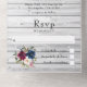 Faire-part de mariage avec peonies bleu marine, blanc et marron rouge et roses avec glissement déchiré rsvp.