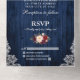 Mariage rustique, aquarelle Bourgogne Floral, Bleu Bois et String Lights Mariage Dentelle All In One Invitation avec RSVP Card comprend roses bordeaux, roses roses roses, roses rouges et verdure botanique.