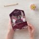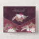 Feuilles élégants de palmiers séchés, Pampas Grass, orchidées et roses le tout dans une invitation de mariage qui inclut les informations mariages et la carte postale RSVP que vos invités déchirent et envoient. Les enveloppes ne sont pas nécessaires. Couleurs de rougeur rose, bordeaux et tons verts. L'arrière - plan est un bordeaux profond et marbré. Idéal pour un mariage tropical, boho ou en soirée.