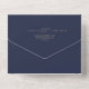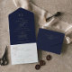 Ce romantique mariage de monogramme marine de calligraphie d'or tout en une invitation est parfait pour un simple mariage. Le design classique moderne comprend des tourbillons fantaisistes et des fleurs fantaisistes avec une magnifique typographie de feuille d'or en faux champagne. Écrivez vos adresses d'invités à l'arrière de l'invitation pliée, ou achetez des autocollants de étiquette de adresse d'invités de coordination (vendus séparément).