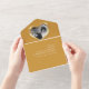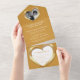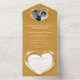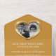 Faire-part de mariage pour une fête d'anniversaire de mariage d'or avec un porte-photo, RSVP détachable, et une conception sans enveloppe requise. Bel effet de dorure liquide en forme de cœur imprimé, cartons d'invitation pour les 50 ans d'anniversaire de mariage, personnalisez avec les détails de votre fête d'anniversaire de mariage, une photo du couple heureux. Le vingt-cinquième anniversaire de mariage est traditionnellement associé à l'or et le cœur symbolise l'amour. D'autres articles assortis sont disponibles. Graphismes et conception par Sarah Trett pour www.mylittleeden.com et www.mylittleedenweddings.com