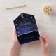Un élégant et insolite faire-part de mariage céleste bleu et or avec détachable. RSVP. Une fois plié, il ressemble à une enveloppe, avec des places pour l'adresse et pour le timbre à l'extérieur et l'adresse de retour imprimé sur le pli, et il peut être envoyé par la poste. Le RSVP détachable a sur son dos l'adresse imprimée et aussi un lieu pour le timbre, de sorte qu'il peut être envoyé par la poste comme carte postale. L'arrière - plan est un ciel étoilé bleu. Le long des frontières (de part et d'autre) il y a des étoiles, au sommet il y a un croissant de lune. Toutes sont de faux feuilles d'argent. Certains mots sont écrits dans un élégant script calligraphique : le mot Mariage, les noms de la mariée et du marié et les mots "Kindly response" dans la RSVP. Le reste est écrit en casquette. Tout le texte est gris argenté, à l'exception de la calligraphie M dans le champ RSVP pour le nom, qui est bleu. Le lieu de l'adresse et les endroits à remplir dans le RSVP sont faux en feuille d'argent rectangles ou carrés.
