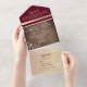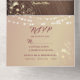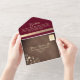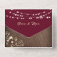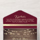 Elégant, moderne, champêtre, bordeaux rouge, or rose et bois rustique mariage invitation tout-en-un avec dentelle florale d'or, script de calligraphie simple, lumières à cordes et image personnalisée du couple à l'arrière. Ajoutez votre photo, les détails du mariage et rsvp.