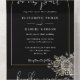 Invitation de mariage gothique tout-en-un avec des fleurs de roses noires et dorées tombant sur une arche dorée entourant une typographie élégante. L'invitation comprend une carte de réponse perforée qui présente le code QR de votre site web de mariage et les détails. Conçu par Thisisnotme©