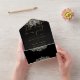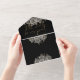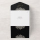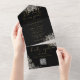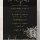 Invitation de mariage gothique tout-en-un avec des roses noires et dorées, des fleurs tombant sur une typographie élégante. L'invitation comprend une carte RSVP perforée avec le code QR de votre site web de mariage et les détails. Conçu par Thisisnotme©