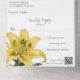 Entrez dans l'élégance avec notre faire-part de mariage All-in-One avec de délicats nénuphars jaunes dorés, symbole de pureté et de beauté. Le design simple et frappant dégage une beauté intemporelle, parfaite pour les couples qui recherchent une touche de sophistication pour leurs invitations de mariage. Les invitations de mariage tout-en-un sont à la fois belles et pratiques en combinant le faire-part de mariage avec une carte postale RSVP perforée facile à enlever. Ils sont aussi rapides et faciles à préparer pour l'envoi. Adressez-vous simplement à l'invitation, pliez le rabat arrière et scellez avec les autocollants clairs inclus. Une fois que vos invités reçoivent l'invitation préadressée, ils arrachent simplement la carte perforée RSVP et la déposez dans le courrier. L'ajout du code QR permet à vos invités d'accéder facilement à votre site mariage pour obtenir des informations, notamment les détails de la réception et les choix de dîner !