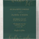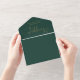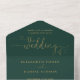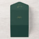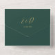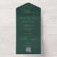 Invitation de mariage tout-en-un vert émeraude et or avec une typographie élégante en écriture cursive et initiales monogrammées. L'invitation comprend une carte de réponse perforée avec votre code QR de mariage personnalisé. Conçu par Thisisnotme