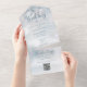 Faire-part de mariage d'hiver tout-en-un avec des flocons de neige sur un fond de givre hivernal. L'invitation comprend une carte RSVP perforée qui peut être adressée individuellement ou laissée vierge pour que vous puissiez écrire les coordonnées de vos invités. Conçu par Thisisnotme