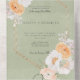 DISPONIBLE AVEC OU SANS CODE QR À ANALYSER OU AVEC OU SANS OPTIONS DE DÎNER. Tout en un design faire-part de mariage dispose d'un cadre floral magnifique de pêche douce rousse et roses roses rose avec d'autres fleurs blanches sur un arrière - plan léger vert sauge et blanc en détresse. Frais et romantique, il est créé par Simply Farmhouse Press.