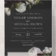 Un luxueux faire-part de mariage fleuri aux fleurs violettes, roses et blanches dans un décor sombre. Les pivoines, le ranunculus et les snapdragons sont les fleurs centrales exposées.