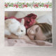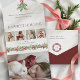 Design botanique de vacances moderne et propre, avec une bordure de coquette rose aquarelle et un faux-pied, quatre modèles photo et élégant "Happiest Holidays" texte de salutation graphique dans une police personnalisée (customisez la couleur dans l'éditeur de texte). Les panneaux comportent des champs de texte, une couronne d'aquarelle fleurie complémentaire avec espace pour votre premier ou monogramme, et une photo de déchirure en bonus.