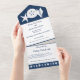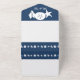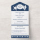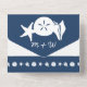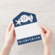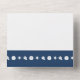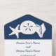 Apportez une touche d'amusement d'été à votre événement avec cette carte tout-en-un de faire-part de mariage et RSVP. À l'intérieur, vous trouverez les silhouettes blanches d'une étoile de mer, d'un dollar de sable et d'un coquillage de conches sur un arrière - plan de la marine profonde au-dessus d'une section avec un exemple de texte qui peut être customisé pour votre journée spéciale. La partie inférieure de l'invitation présente une pièce amovible de taille carte postale qui contient un échantillon de texte RSVP placé au-dessus d'une frontière bleu marine avec un motif de coquillages, d'étoiles de mer et de dollars de sable éparpillés dans le fond. À l'extérieur, une bordure semblable de coquillages de la marine se trouve sous les zones où vous ajouteriez des timbres, des normes et des adresses de retour pour l'invitation dans son ensemble et la section RSVP consignée. Le rabat utilisé pour plier et sceller la carte a l'étoile de mer, dollar de sable, et coquille de conque sur un arrière - plan bleu profond avec un échantillon d'initiales que vous pouvez customiser pour une touche personnelle finale et pour cintrer l'atmosphère de plage d'été. Assurez-vous de consulter le reste des coquillages d'été de la Marine pour d'autres produits de coordination, y compris les étiquettes d'adresse de retour.