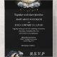 Une belle invitation crescendo céleste tout en un présente un couple de nuptiaux debout sur une demi lune ornée qui semble éclater contre un arrière - plan noir de minuit. Il y a des nuages gris moelleux et de petites étoiles scintillantes qui ont aussi une sensation mystique pour eux. Ces graphismes de contenu génératif sont idéaux pour une nuit étoilée, sur la lune, la galaxie ou le mariage à thème céleste ou un événement spécial. Le tiers inférieur a une carte de réponse déchirante avec adresse rsvp personnalisée pour vos invités à compléter.