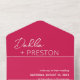 Viva Magenta rose moderne tout en un faire-part de mariage avec un design simple et minimal avec le nom de la mariée dans un script élégant et le nom du marié dans une police sans serif contemporaine. Vous trouverez ci-dessous, dans le coin inférieur droit, les détails de votre événement dans un agencement minimaliste.