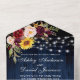 Mariage rustique, aquarelle Bourgogne Floral, Bleu Bois et String Lights Mariage Dentelles All In One Invitation avec RSVP Card inclut des roses bordeaux, roses roses roses, roses rouges, tournesols et verdure botanique.