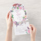DISPONIBLE ÉGALEMENT AVEC UN CODE QR À ANALYSER DANS LA ZONE RSVP. Ce design présente un cadre ovale fleuri de lilas pourpre et rose, de roses et d'autres fleurs agrémentées d'eucalyptus et de verdure. Un oiseau sucré surplombe la couronne de fleurs. Les invitations tout-en-un personnalisées sont une combinaison unique d'une invitation personnalisée magnifiquement imprimée et d'une carte postale RSVP perforée facile à déchirer. Et ils sont si faciles à utiliser ! Il suffit de plier, puis de sceller le rabat arrière avec les trois autocollants clairs inclus, et le courrier. Et quand vos invités reçoivent votre invitation personnalisé, ils déchirent la carte RSVP perforée et vous la remettent dans le courrier !