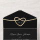 Partagez vos détails mariages dans un style élégant avec ce monogramme d'or et noir tout-en-un faire-part de mariage. Doté d'un coeur romantique de cordes d'or, d'initiales personnalisées, d'un arrière - plan noir élégant et d'un code QR scannable pour des RSVP faciles, ce design allie confort moderne et sophistication intemporelle. Parfait pour les couples à la recherche d'une suite mariage design et épurée.