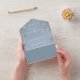 Faire-part de mariage fleuri tout-en-un avec typographie de coeurs élégants et initiales monogrammes sur un arrière - plan bleu poussiéreux. L'invitation comprend une carte RSVP perforée qui contient le code QR de votre site Web mariage. Conçu par Thisisnotme©