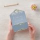 Le tout dans un faire-part de mariage avec de jolies lampes à cordes, une végétation botanique fleurie et une typographie élégante sur un arrière - plan bleu poussiéreux. L'invitation comprend une carte RSVP perforée avec un code QR. Conçu par Thisisnotme©