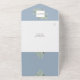 Faire-part de mariage tout-en-un avec d'élégants feuilles botaniques d'aquarelle sur un arrière - plan bleu poussiéreux et une bordure dorée chic. L'invitation comprend une carte RSVP perforée avec un code QR. Conçu par Thisisnotme©