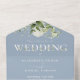 Une élégante faire-part de mariage tout en un avec une jolie typographie de verdure sur un arrière - plan bleu poussiéreux. L'invitation comprend une carte RSVP perforée avec votre code QR du site Web mariage. Conçu par Thisisnotme©