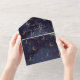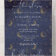 Cette faire-part de mariage tout-en-un présente une typographie élégante sur une lune céleste et des étoiles arrière - plan. L'invitation comprend une carte RSVP perforée avec votre code QR du site Web mariage. Conçu par Thisisnotme©