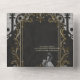 Elégance en argent et noir. Cette image présente une illustration en noir et blanc d'un cadre mariage aux motifs en or et en argent complexes. Le cadre est orné de motifs floraux ornés et d'une arcade centrale. Une mariée en robe flottante, tenant un bouquet, se tient dans le cadre, face à l'extérieur du spectateur. L'arrière - plan est une surface noire texturée, créant une atmosphère dramatique et élégante.