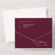 Cette invitation tout-en-un présente un élégant style minimaliste moderne avec une belle formulation de script de calligraphie, "le mariage de" et de code photo et qr sur un arrière - plan bordeaux avec une police de texte en or champagne. La simplicité de ce design ajoute une touche d'élégance à votre mariage. Il fonctionne bien avec de nombreux thèmes mariages et certainement un grand ajout à votre mariage. Il suffit de customiser les noms et le libellé en quelques étapes simples et de personnaliser la carte d'invitation tout-en-un avec votre photo du couple heureux et de remplacer le code QR par le vôtre pour donner à votre invitation une touche personnelle agréable. Cette invitation vous fera économiser de l'argent pour envoyer tout en même temps. Il a une carte postale perforée RSVP peut être facile à déchirer et votre invité vous l'envoie. Il suffit de plier chaque carte dans la forme esquissée — sceller et envoyer à vos invités. Aucune enveloppe n'est nécessaire pour l'expédition — juste l'affranchissement. Remarque : le script élégant de typographie de calligraphie de "le Mariage de", "réception à suivre", "réponse aimable", et "livrer à" avec les lignes et autres éléments d'illustration graphique et les mots ne peuvent pas être modifiés, déplacés et/ou supprimés. Elles sont réparées. Si vous devez changer la couleur, vous pouvez customiser l'invitation à la carte. Vous pouvez customiser et personnaliser l'invitation afin de répondre à vos besoins mariages et cliquez simplement sur personnaliser de l'invitation.