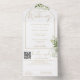Invitation de mariage tout-en-un avec feuillage botanique rustique tombant sur une arche dorée enfermant une typographie élégante. L'invitation comprend une carte RSVP perforée avec le code QR de votre site web de mariage et les détails. Conçu par Thisisnotme©