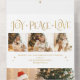 Elegant, minimal and modern "Joy + Peace + Love" timeless script graphic message in a hammered gold textured style with a three-photo template and four editable text fields on a clean white background.