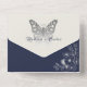 Faire-part de mariage tout-en-un bleu marine élégant, moderne et sophistiqué avec dentelle florale gris argenté, photo au centre arrière et adorable papillon unique - symbole de renaissance spirituelle, d'espérance et de vie. Choix parfait pour les mariages d'hiver romantiques contemporains ! Ajoutez votre photo, les détails du mariage et rsvp.