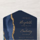 Le bord gauche de cette élégante faire-part de mariage tout-en-un moderne et RSVP est doté d'une bordure en aquarelle bleu marine ornée d'une parties scintillant en faux or. Le texte personnalisable combine écriture manuscrite couleur or, cuivre et polices italiques sur un arrière - plan bleu marine. L'adresse de retour apparaît sur le rabat extérieur et sur le côté arrière de la carte RSVP détachable en texte doré sur bleu marine solide.