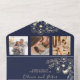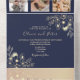 Cet élégant faire-part de mariage bleu marine tout-en-un présente des illustrations florales d'or délicates, un collage photo romantique et un code QR moderne pour des RSVP faciles. Parfait pour les couples qui veulent un moyen sophistiqué, sophistiqué, sophistiqué, et belle façon d'annoncer leur journée spéciale. Customisez facilement vos noms, votre date et votre site Web pour une expérience client transparente.
