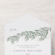 Une aquarelle peinte à la main verdure feuille, le tout dans un design faire-part de mariage avec le type classique et les couples modernes monogramme dans le coin supérieur gauche. La verdure balaie tous les aspects de cette carte, donnant l'impression que les feuilles et les branches se balancent dans la douce brise du vent. Parfait pour les mariages extérieurs ou intérieurs, décontractés ou formels.