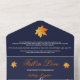 Cette élégante invitation mariage de automne est parfaite pour un mariage d'automne moderne. Le design simple présente des feuilles de chute verte avec une élégante typographie blanche et orange sur un arrière - plan bleu marine.