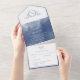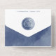 Élégant tout-en-un tri-plié avec carte postale RSVP perforée. Conception avec des détails de lavage marine et bleu aquarelle et un monogramme botanique délicat dessiné à la main avec initiales de couple. Eléments calligraphiques écrits à la main modernes. Respectueux de l'environnement, puisqu'il n'est pas nécessaire d'insérer des cartes supplémentaires, des cartes RSVP ou même des enveloppes, cette invitation a tout ! Possibilité d'ajouter à la fois les détails de la cérémonie et de la réception des Mariages, ainsi que la carte postale RSVP prêt à être rempli et envoyé par la poste! Option pour commander des invitations avec un nom d'invité imprimé (ou écrit à la main plus tard) au dos afin que vous puissiez envoyer une carte sans besoin d'aucune enveloppe, - OU - si vous préférez utiliser une enveloppe, effacez simplement le nom d'invité et les caractères d'adresse des zones de texte pour supprimer, ou ajoutez un devis à la place. Extérieur rsvp retour avec beau arrière - plan marine et bleu teintes aquarelle couleur. Un design attrayant pour le couple élégant, mais pratique et respectueux de l'environnement! Une partie de notre collection "Marine Watercolor Botanical Monogram Mariage" avec une variété de produits de coordination disponibles, y compris des accessoires d'expédition et des produits d'événements. Visitez la collection entière avec ce lien : https://www.zazzle.com/collections/navy_watercolor_botanical_monogram_wedding-119781162008756698