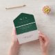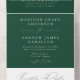 Faire-part de mariage tout-en-un élégant avec vos initiales monogrammes et détails mariages en texte blanc avec accents de script de calligraphie moderne sur un arrière - plan vert émeraude. Le design comprend une carte RSVP détachable en bas, que les clients peuvent facilement envoyer par la poste en tant que carte postale - aucune enveloppe nécessaire - un choix raffiné et pratique pour votre journée spéciale.