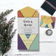 Cette faire-part de mariage moderne est parfaite pour le couple qui veut faire une déclaration élégante. L'invitation présente une calligraphie rétro audacieuse sur un rectangle blanc avec un arrière - plan géométrique abstrait vibrant et super. La combinaison artistique de l'ancien et du nouveau donne à tout événement une touche unique et accueillante. Que vous planifiez un simple rassemblement ou une grande fête, cette invitation fera en sorte que vos invités sachent que c’est une occasion de se souvenir.