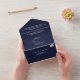 Cette élégante faire-part de mariage bleu marine est parfaite pour un mariage moderne. le design simple comprend une élégante calligraphie blanche sur un arrière - plan bleu.