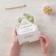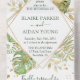 Cette élégante faire-part de mariage tropicale présente un feuillage vert exotique aux accents dorés. Un cadre doré géométrique moderne met en évidence le texte vert foncé. Les plaques d'or accentuent l'élégante décoration botanique et apportent un peu de fantaisie sophistiquée à l'invitation. La carte RSVP est détachable et prête à être envoyée par la poste avec une adresse de retour pré-imprimée. Cet invitation d'oasis insulaire est parfait pour tout mariage extérieur, plage ou destination.