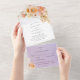 Élégant tout-en-un tri-plié avec carte postale RSVP perforée. Design à l'aquarelle délicate florale en cascade présentant vos détails mariages dans un magnifique mélange de fleurs pêche, orange, rose poussiéreux, rougissant, crème et champagne teintes. RSVP dans l'arrière - plan de lavage à l'aquarelle attrayant dans les tons lavande violette. Eléments calligraphiques écrits à la main modernes. Respectueux de l'environnement, puisqu'il n'est pas nécessaire d'insérer des cartes supplémentaires, des cartes RSVP ou même des enveloppes, cette invitation a tout ! Possibilité d'ajouter à la fois les détails de la cérémonie et de la réception des Mariages, ainsi que la carte postale RSVP prêt à être rempli et envoyé par la poste! Possibilité d'ajouter ou d'effacer des options de repas RSVP. Option pour commander des invitations avec un nom d'invité imprimé (ou écrit à la main plus tard) au dos afin que vous puissiez envoyer une carte sans besoin d'aucune enveloppe, - OU - si vous préférez utiliser une enveloppe, effacez simplement le nom d'invité et les caractères d'adresse des zones de texte pour supprimer, ou ajoutez un devis à la place. Extérieur avec belle couleur d'aquarelle en lavande violette et rabat avec un exquis monogramme floral avec initiales de couples. Un design attrayant pour le couple élégant, mais pratique et respectueux de l'environnement! Une partie de notre collection "Peach Floral Delight and Lavender Purple" avec une variété de produits de coordination disponibles. Visitez l'ensemble de cette collection à l'adresse suivante : https://www.zazzle.com/collections/peach_delight_floral_and_lavender_purple-119272840408758311