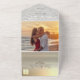 Simple, élégant, calligraphie moderne, invitation de mariage de plage dorée avec image, motif d'océan et de sable et lumières de chaîne.