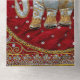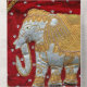 Image d'un éléphant indien décoré de paillettes et perles en blanc, argent et or contre velours rouge marron.