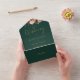 Faire-part de mariage tout-en-un avec élégante typographie or sur un arrière - plan vert émeraude. L'invitation comprend une carte RSVP perforée avec votre code QR du site Web mariage et des détails. Conçu par Thisisnotme©
