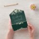 Le tout dans un faire-part de mariage avec de jolies lampes à cordes, une végétation botanique fleurie et une typographie élégante sur un arrière - plan vert émeraude. L'invitation comprend une carte RSVP perforée avec un code QR. Conçu par Thisisnotme©