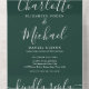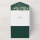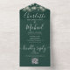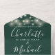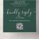 Le tout dans une seule faire-part de mariage avec de jolies lampes à cordes, des noms de style signature et une typographie chic sur un arrière - plan vert émeraude. L'invitation comprend une carte RSVP perforée avec un code QR. Conçu par Thisisnotme©