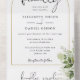 Invitation de mariage reporté tout-en-un avec feuillage botanique rustique tombant sur une arche dorée entourant une typographie élégante. L'invitation comprend une carte RSVP perforée avec le code QR de votre site web de mariage. Conçu par Thisisnotme©
