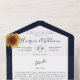 Le tout dans un faire-part de mariage à trois plis avec des tournesols aquarelles et des tournesols linearts sur un arrière - plan bleu marine. Faire-part de mariage, carte rsvp, détails et combinaison enveloppe.