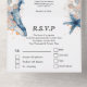Une belle invitation tout-en-un au printemps ou à l'été avec un bord de corail orange et bleu et de fleur rose sur lequel un hippocampe d'aquarelle ; baleines et étoiles de mer apparaissent autour des modèles pour votre formulation personnalisée. Le tiers inférieur a une carte de réponse déchirante avec adresse rsvp personnalisée pour vos invités à compléter. Elles sont idéales pour la plage ; Hawaïen ; mariage côtier et tropical, fiançailles, anniversaire et fête d'anniversaire.